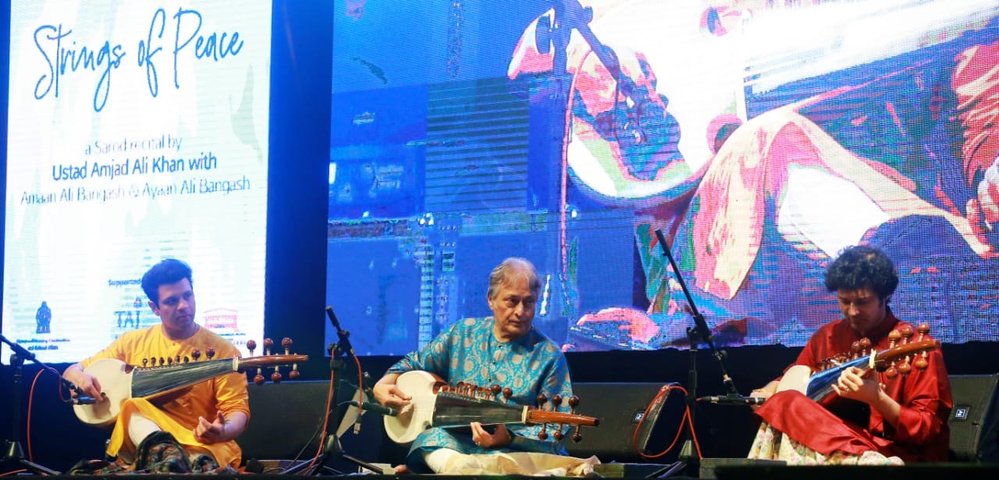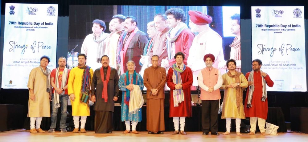 To commemorate India´s 70th Republic Day a special cultural concert “Strings of Peace” was organized at BMICH, Colombo on January 25, 2019. The event featured an enthralling performance by legendary Sarod maestro Ustad Amjad Ali Khan along with Amaan Ali Bangash and Ayaan Ali Bangash. The musical evening showcased melodious symphony of Indian classical instrumental music. The trio was accompanied by eminent percussionists Mr. Satyajit Talwalkar and Mr. Shubh Maharaj.