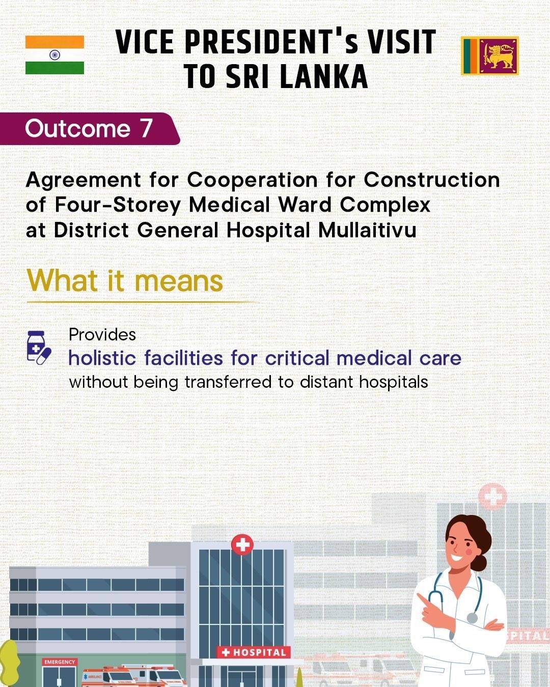 - MoU for construction of a four-storey Medical Ward Complex at District General Hospital in Mullaitivu.